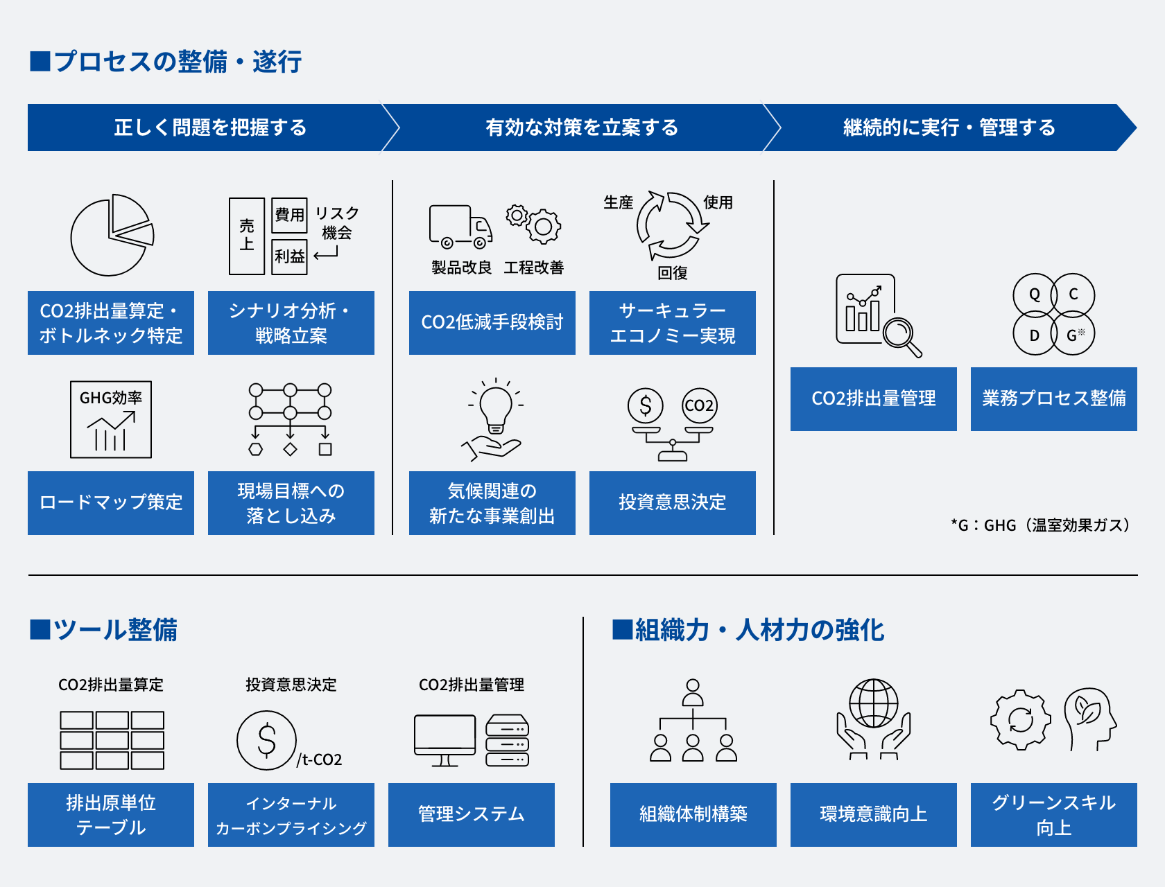 サステナブルな社会の実現に向け、多くの企業がカーボンニュートラルという課題に直面しています。最近では、経営企画や環境部門だけでなく、開発・製造部門のような現場の方々からも多くの悩みの声が聞かれます。このような悩みを解決し、カーボンニュートラルを実現するには、プロセスを整備し、遂行することが肝要です。また、ツール整備や組織力・人材力強化を行い、プロセス遂行力を最大化する必要があります。