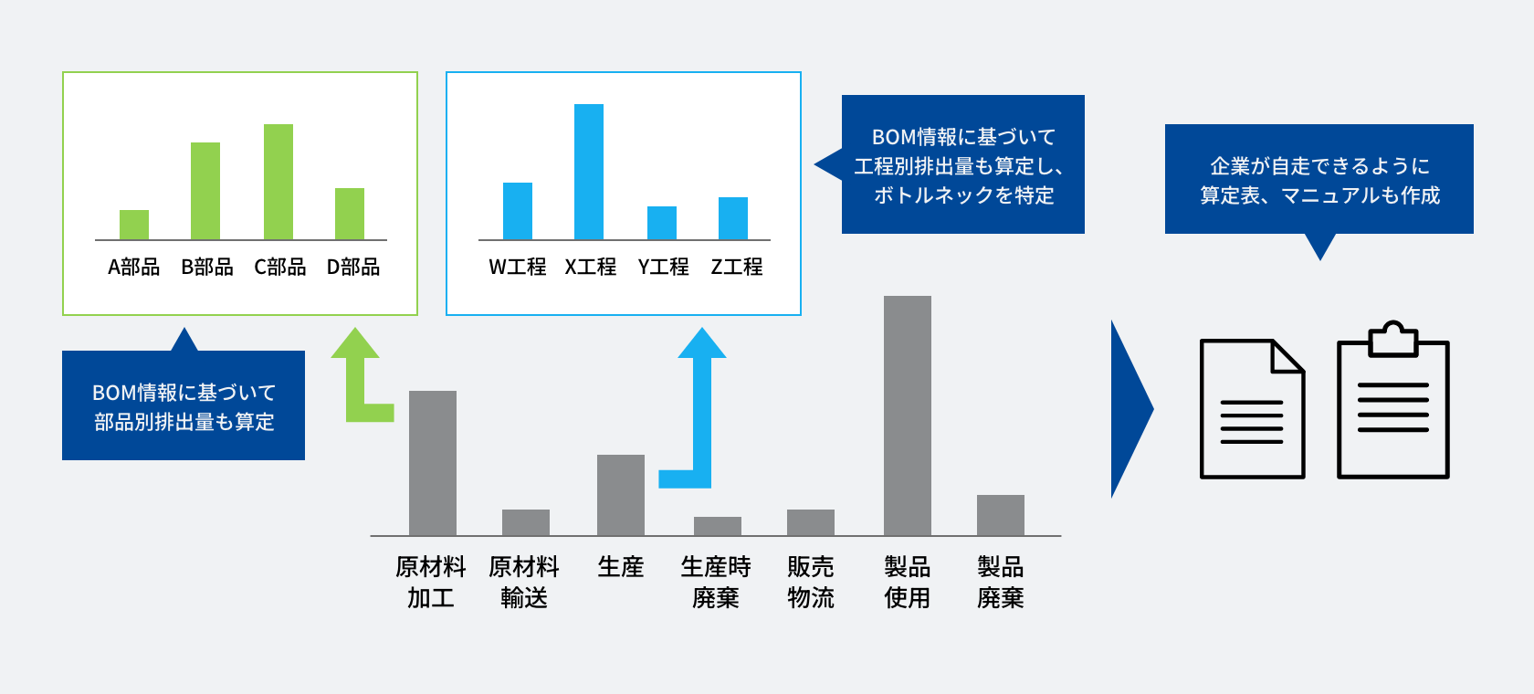 製品開発段階で製品カーボンフットプリント(CFP)を導出ロジックを検討し、早期にPDCAを回せる仕組みを構築します。また、BOM・BOP情報に基づき部品別・工程別の排出量を分析し、ボトルネックを特定することで排出量削減施策を検討しやすくします。さらに、企業が自走できるよう、算定表やマニュアルを整備します。