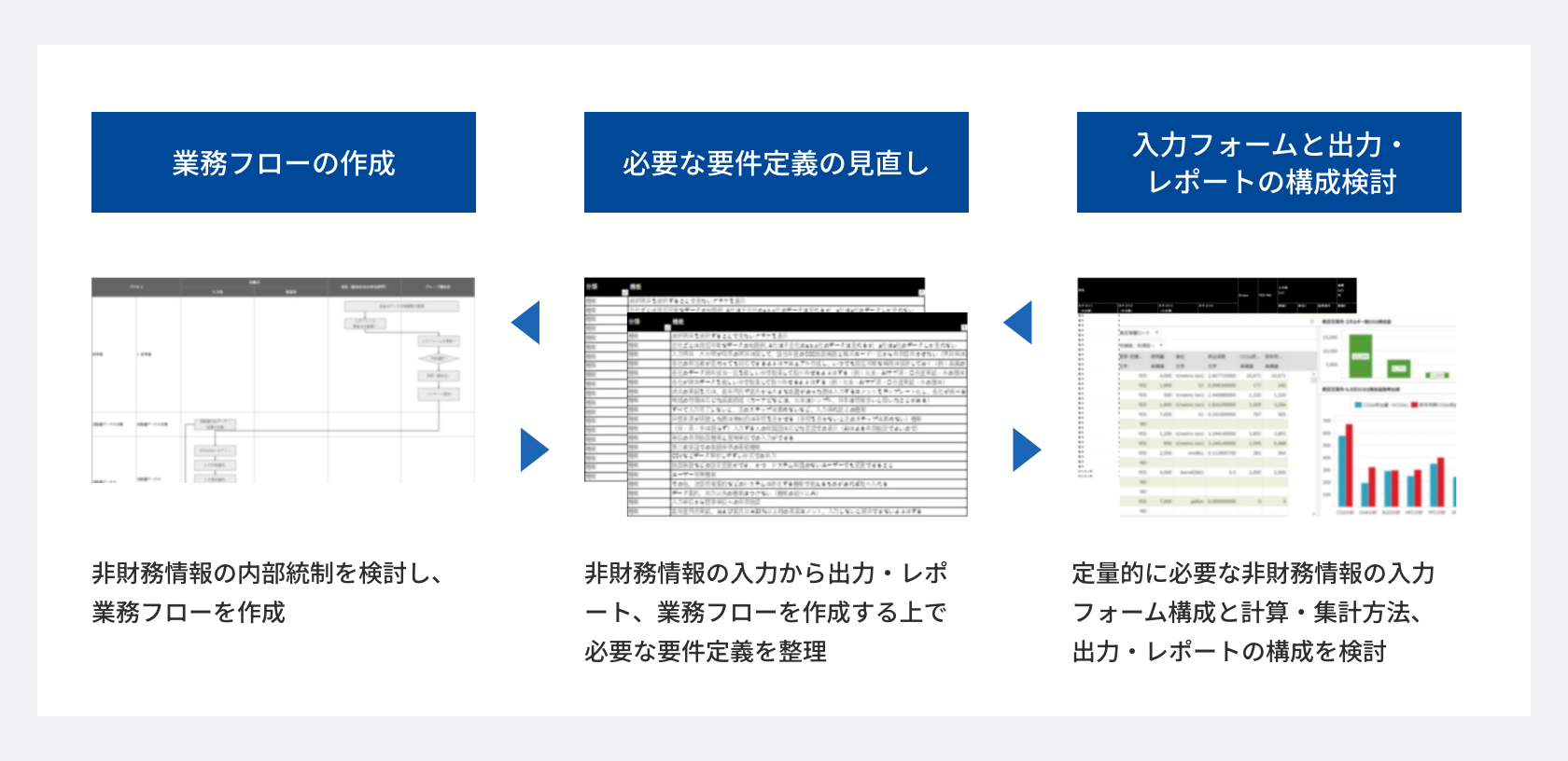 日本国内でも様々な規制対応が必要になってきており、一元管理がもとめられている中、電通総研の過去の実績から作成した非財務開示項目がテンプレートを元に、すぐに必要な管理情報を一元化可能としています。管理に必要なシステム・業務体制構築のため、「業務フロー」「入力フォームと出力・レポートの構成検討」を整理することで、もれなく要件定義に落とし込みます。